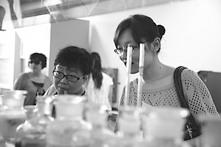 图为在邢台市质监局组织的实验室开放互学活动中,观摩人员正在认真仔细地观看相关检验流程。